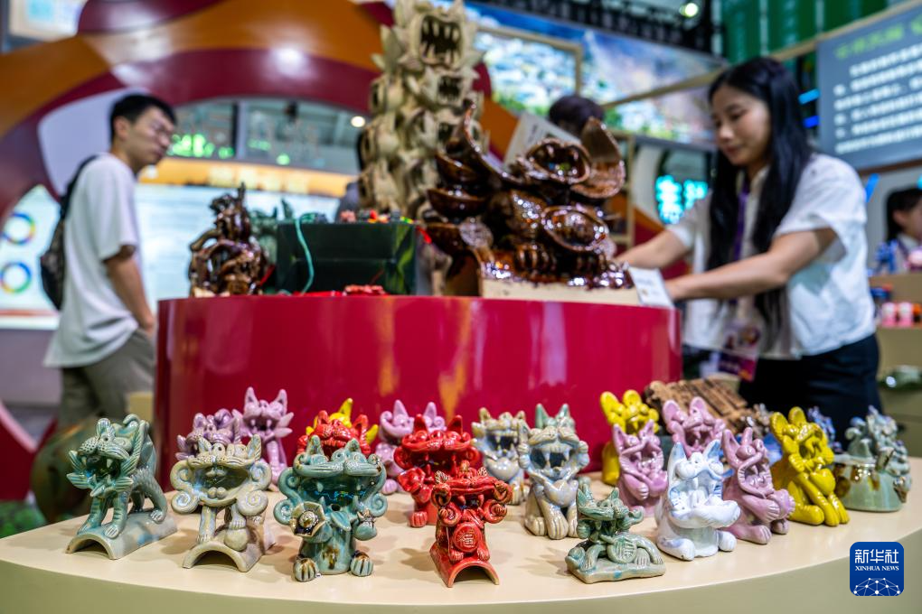 6月20日,观众在第9届中国—南亚博览会旅居云南馆非遗瓦猫展台参观。新华社记者 胡超 摄