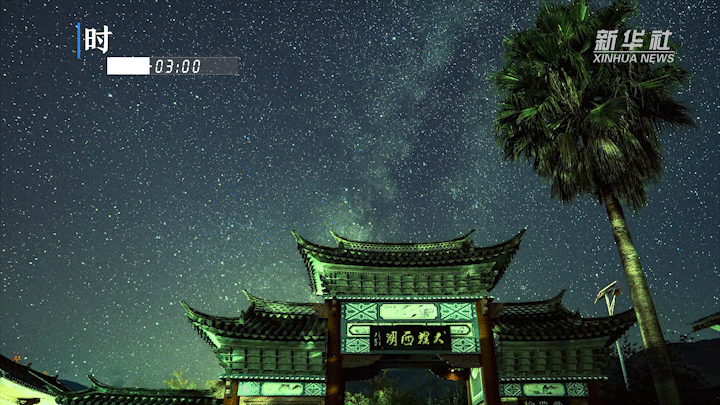 子时(23:00-01:00),风平浪静,星辰环绕,划出一道道星轨。