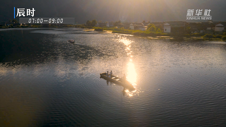 辰时(07:00-09:00),曙光初照,湖面波光粼粼。村民们划着小木船,开始了一天的劳作。