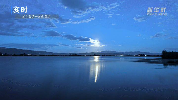 戌时(19:00-21:00),夜幕降临,圆月升起,月光洒在湖面,粼粼清辉里浮动着万千银鳞。