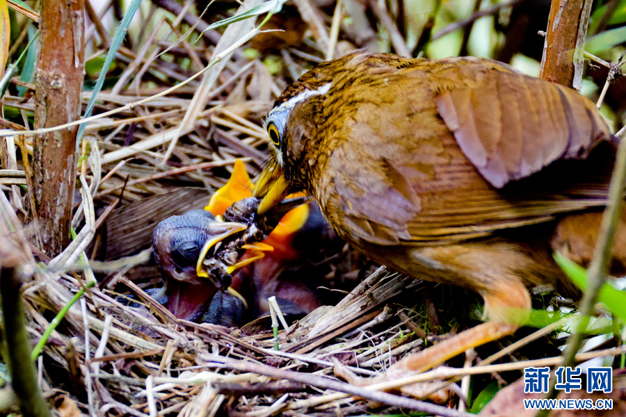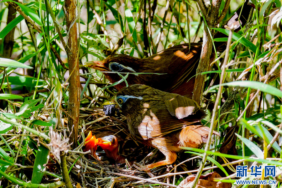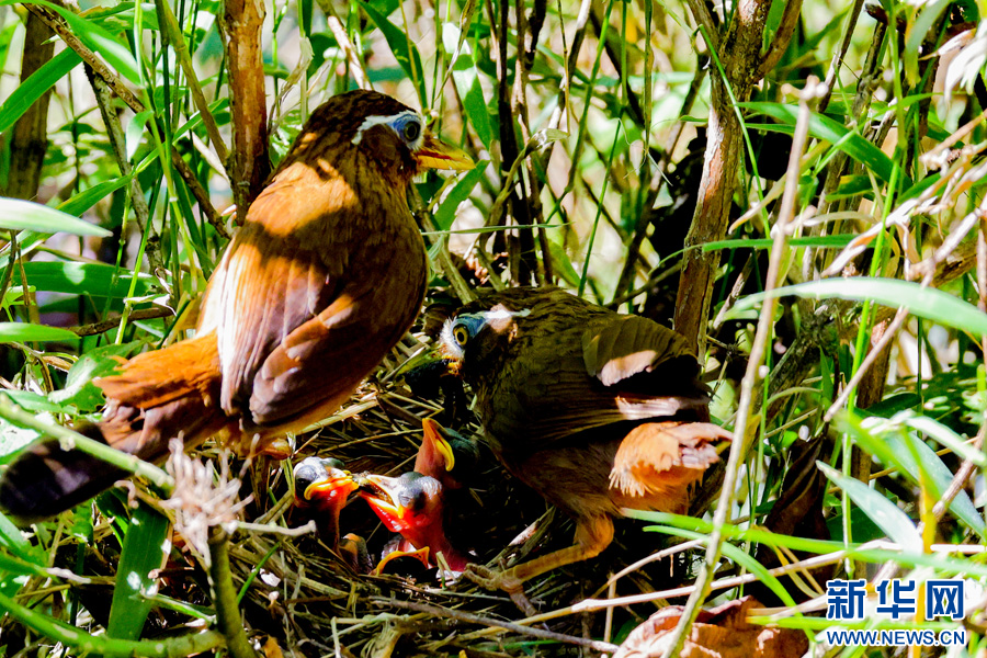 画眉鸟“夫妇”守护雏鸟进食(6月21日摄)。新华网发(张天祥 摄)