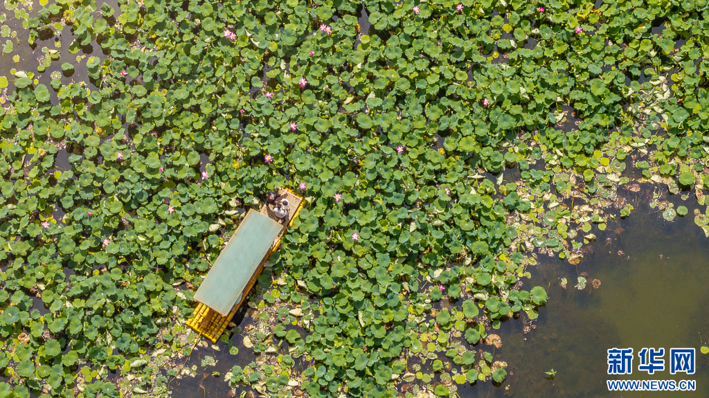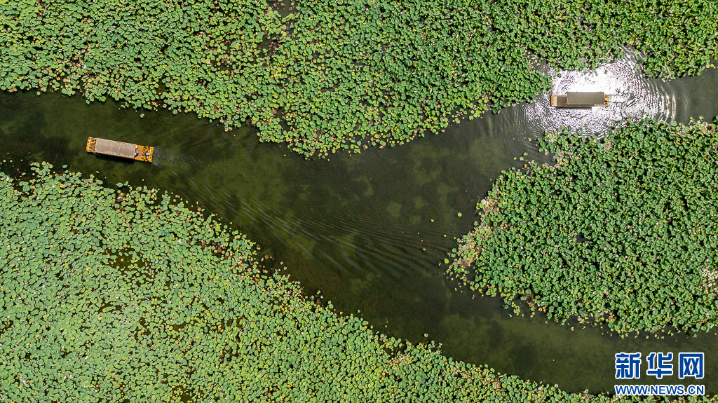 穿行于荷间水道的游船(7月19日摄)。新华网发(刘东 摄)