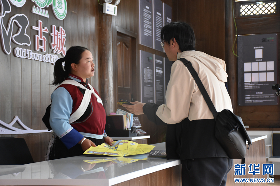 丽江古城旅游咨询服务站工作人员为游客服务(7月23日摄)。新华网发(供图)
