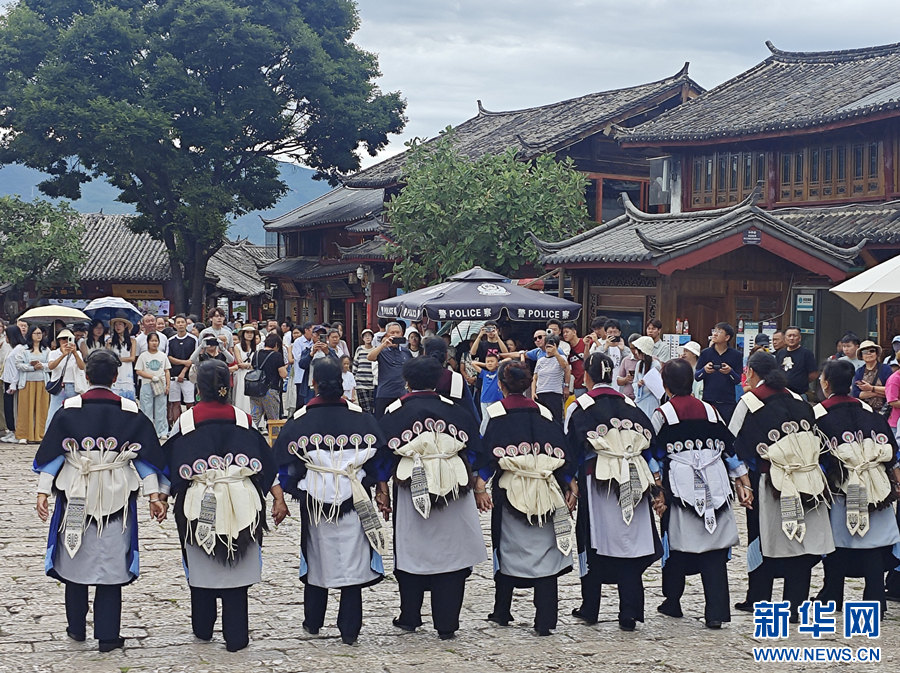 游客在丽江古城四方街观看表演(7月23日摄)。新华网发(供图)