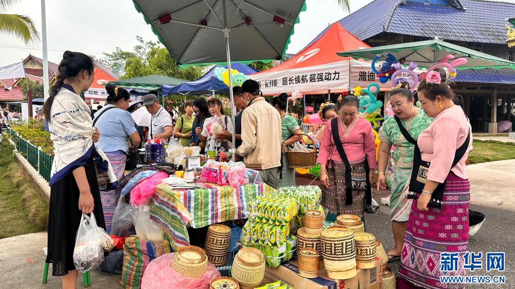 5月6日,人们在勐满镇曼烈村举行的中老边民“国际老庚大赶摆”活动上选购特色商品。(勐腊县委宣传部供图)