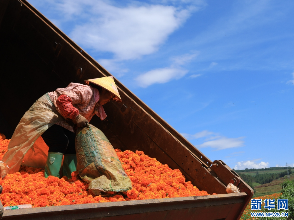 8月10日,云南省红河哈尼族彝族自治州蒙自市冷泉镇兴隆村的花农将万寿菊装车。新华网发 (薛莹莹 摄)