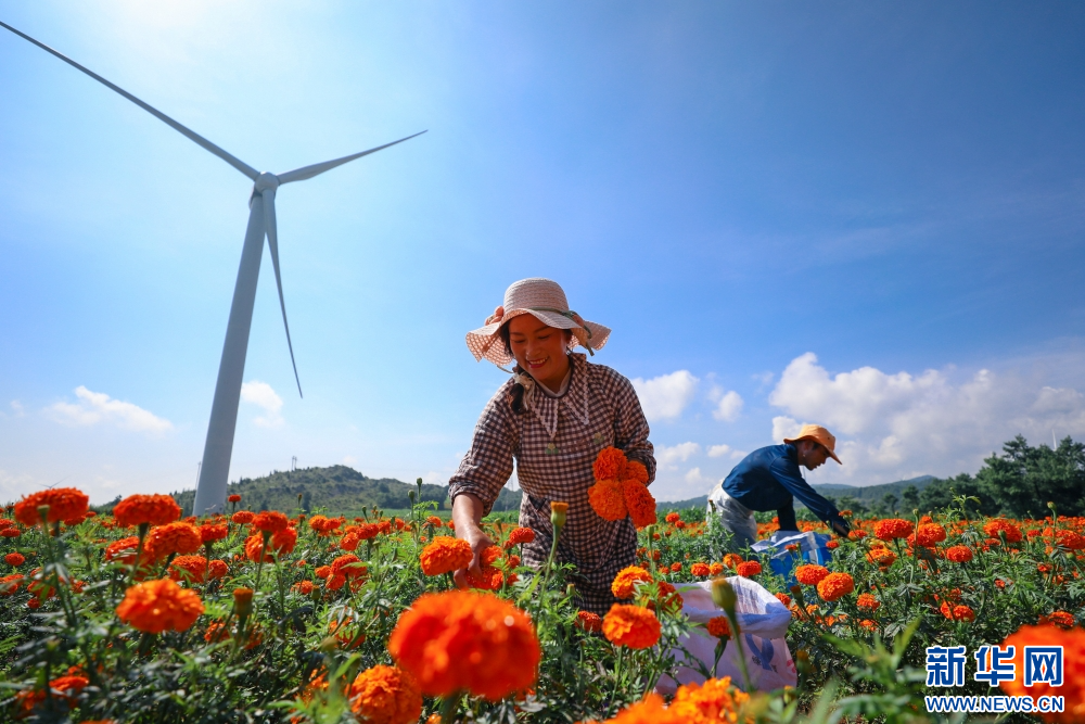 8月6日,在云南省红河哈尼族彝族自治州开远市灵泉街道洒红口村,花农正在采收万寿菊。新华网发(陶家淇 摄)