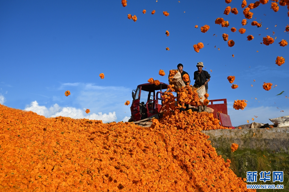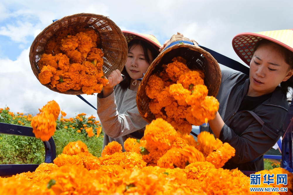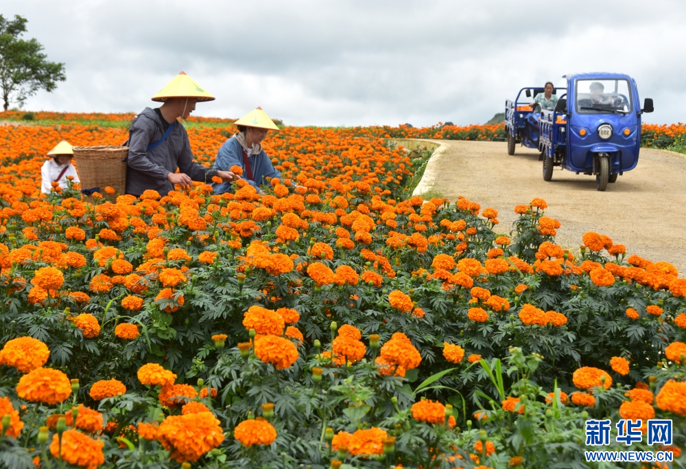 8月5日,在云南省曲靖市陆良县活水乡雨麦红村,花农正忙着采收万寿菊。新华网发 (王勇 摄)