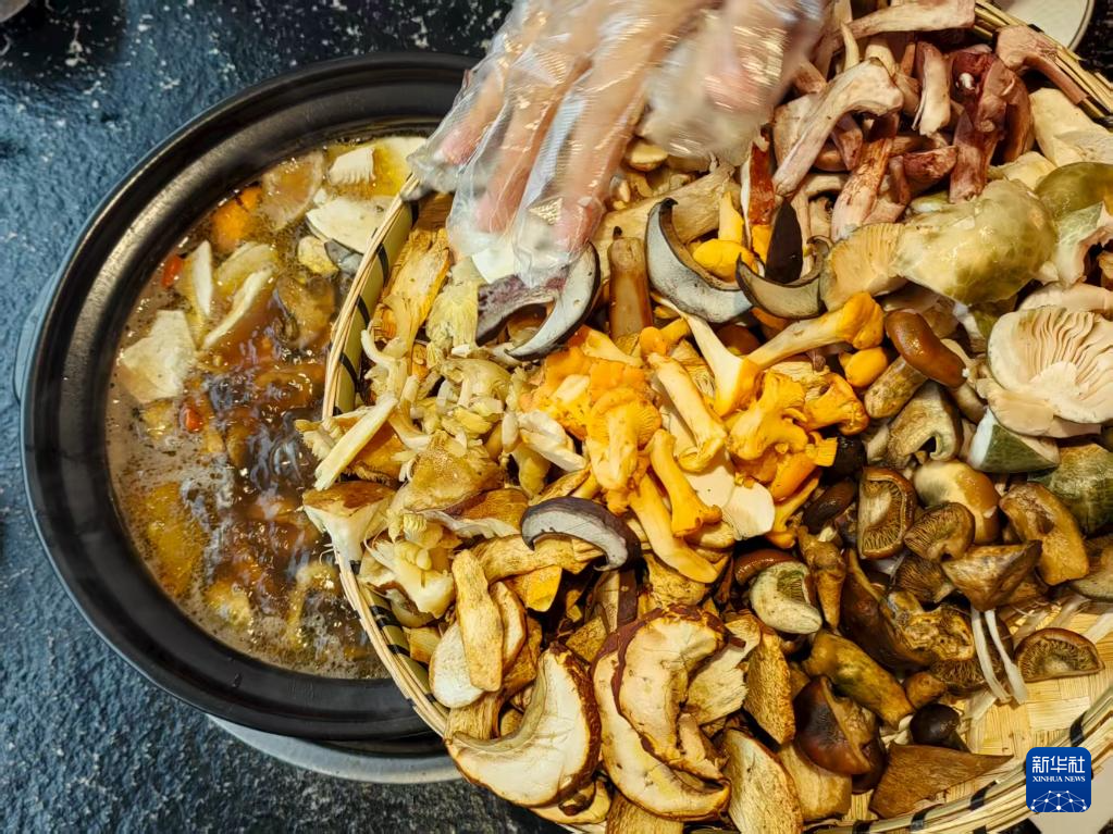 在云南昆明一家主打野生菌火锅的餐饮店内,工作人员将野生菌拼盘下入煮沸的火锅中。新华社记者 荆昭延 摄