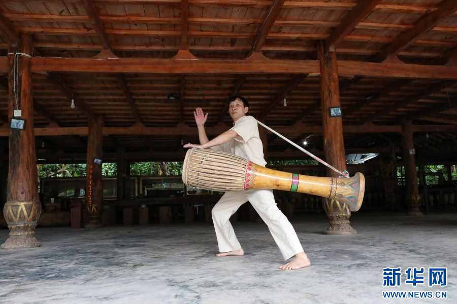 8月16日,波罕丙查看象脚鼓。新华网发(李云生 摄)