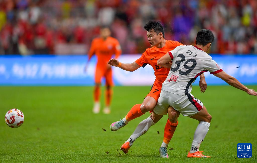 8月23日,云南玉昆队球员奥斯卡(右)与成都蓉城队球员李扬(左)在比赛中拼抢。新华社记者 陈欣波 摄