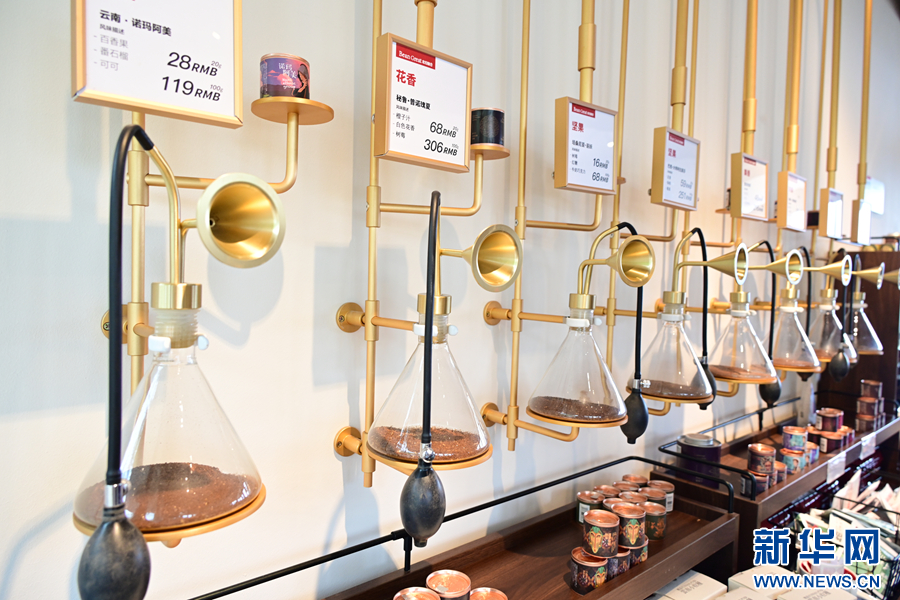 在景迈山北归咖仓,游客可通过闻香瓶感受不同咖啡的风味(8月26日摄)。新华网发(刘起 摄)