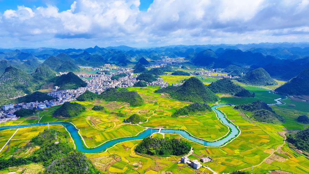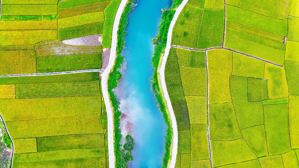 近日,云南省文山壮族苗族自治州广南县八宝镇迎来丰收季。45000亩水稻渐次成熟,广袤田野化作多姿多彩的色块。谷浪翻涌,清香四溢,清澈的河水映照着两岸的绿树与错落的民居,一幅动人的丰收画卷正徐徐展开。