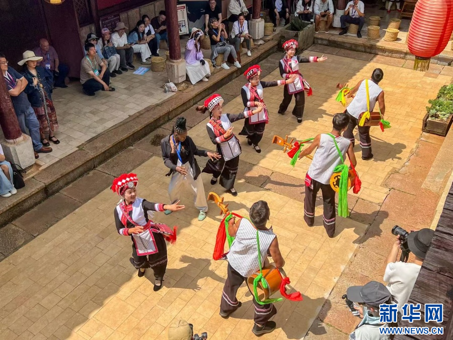 9月8日,嘉宾们来到弥勒市可邑小镇景区,在阿细跳月传习点深入了解国家级非物质文化遗产代表性项目彝族三弦舞——阿细跳月。据介绍,彝族三弦舞是彝族人民代代相传的一种民间舞蹈,流传于阿细彝区的三弦舞称“阿细跳月”,在阿细语中称为“嘎斯比”,意为“欢乐跳”。