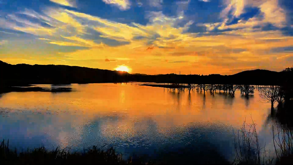 近日,摄影师在云南省会泽县的念湖畔拍摄了日落美景。夕阳西沉,霞光浸染天际,湖面泛起金色涟漪。群鸟翩跹飞越,霞光与云影和水纹交织,构成一幅美丽和谐的秋景图。