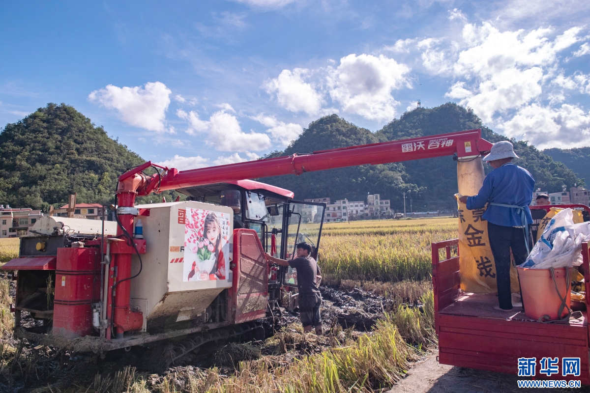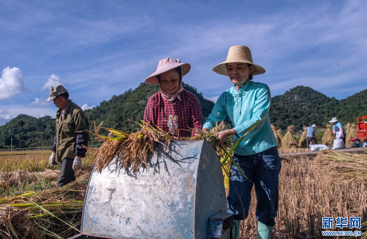云南省广南县八宝镇,八宝米进入集中收割期,农户收割稻谷(9月15日摄)。新华网发(熊平祥 摄)