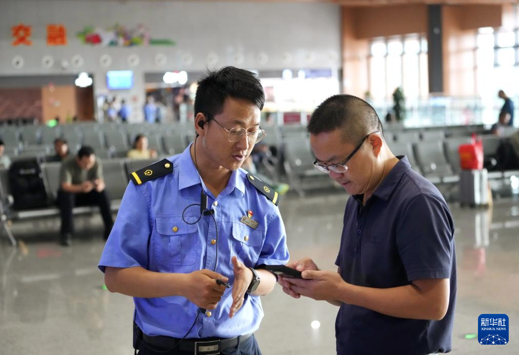 9月20日,普洱站的工作人员刘发贵在解答旅客的问题。新华社记者 邢广利 摄
