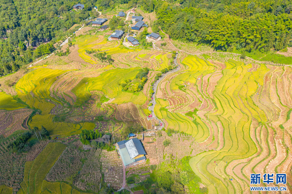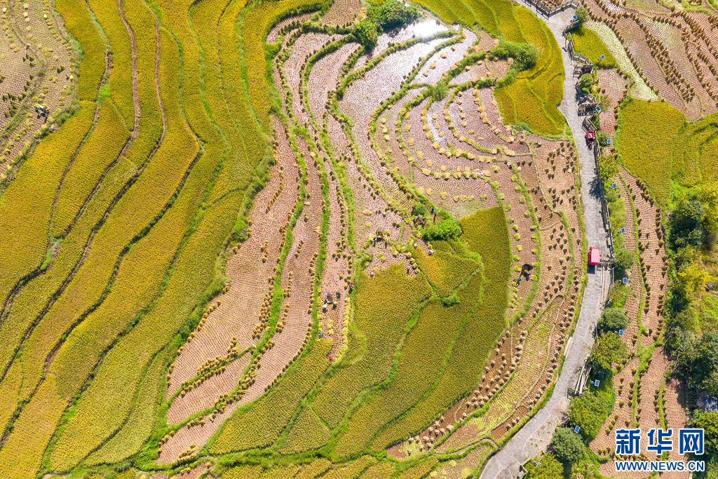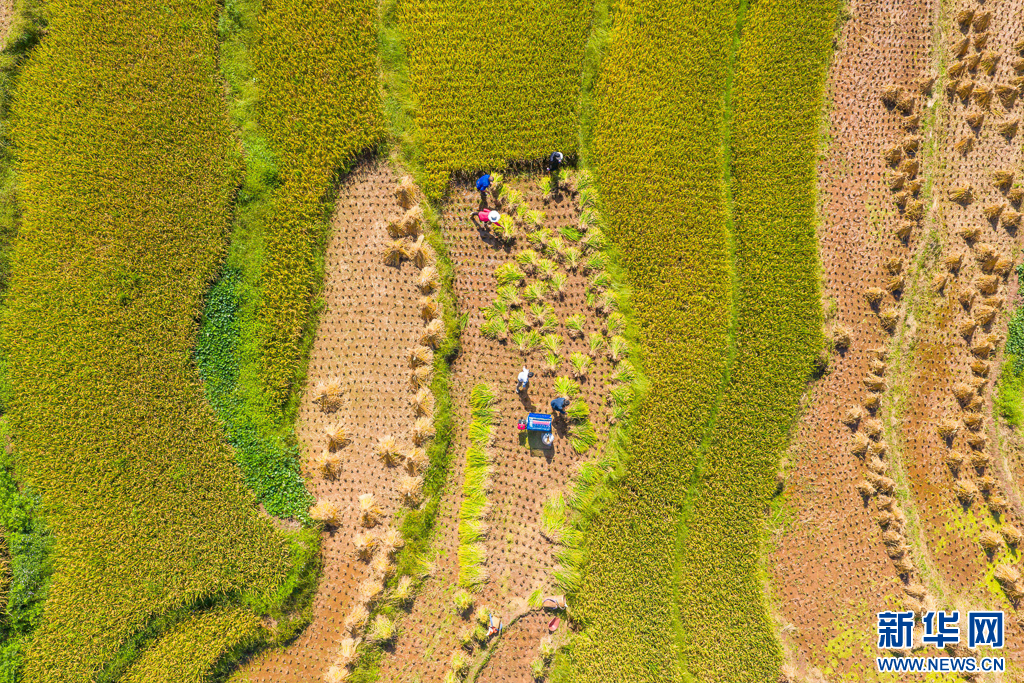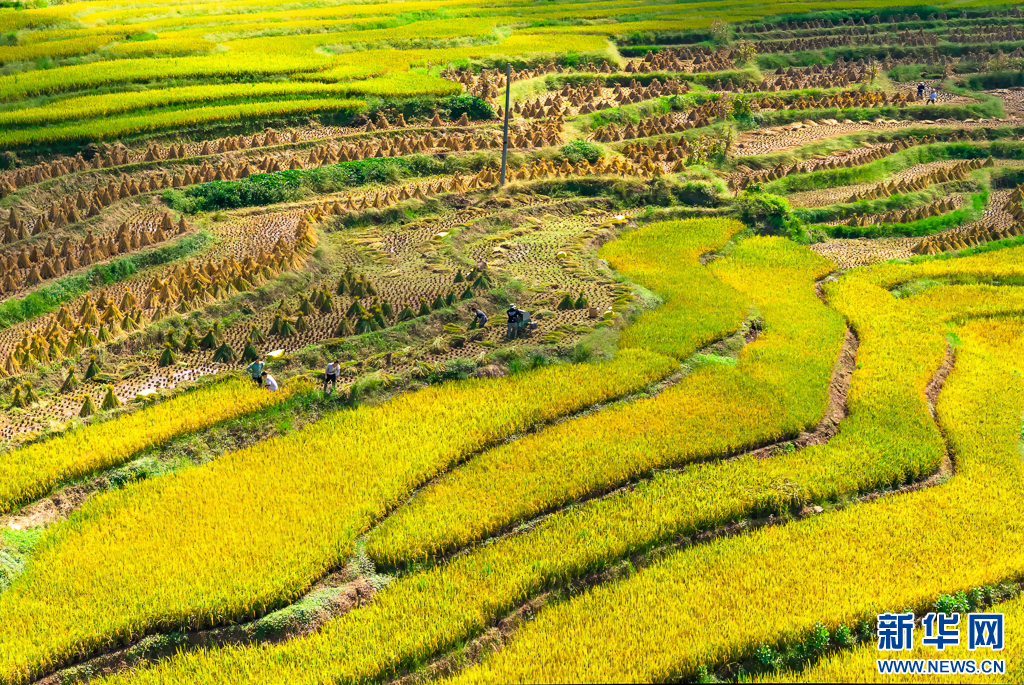 金秋时节,云南省昭通市绥江县中城镇回望村,数百亩高山梯田水稻逐渐成熟,当地群众抢抓晴好天气收割水稻,现场一派喜人“丰”景。(完)