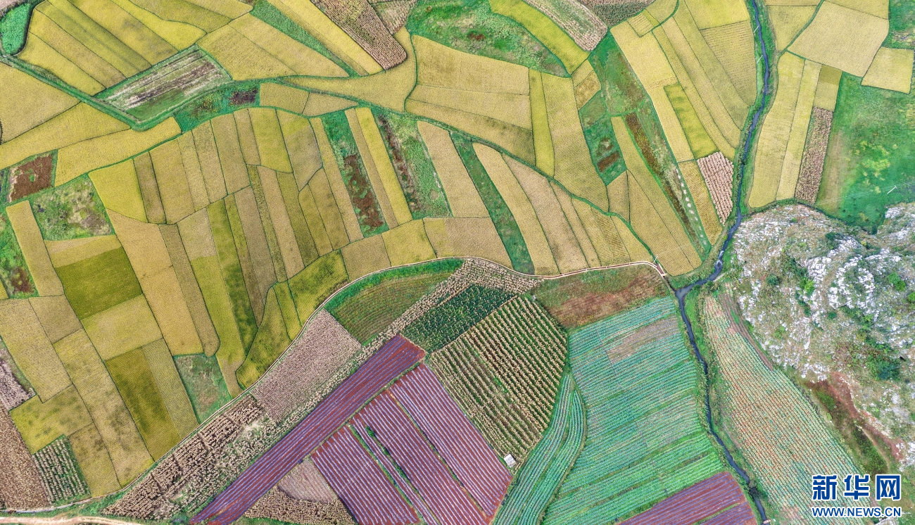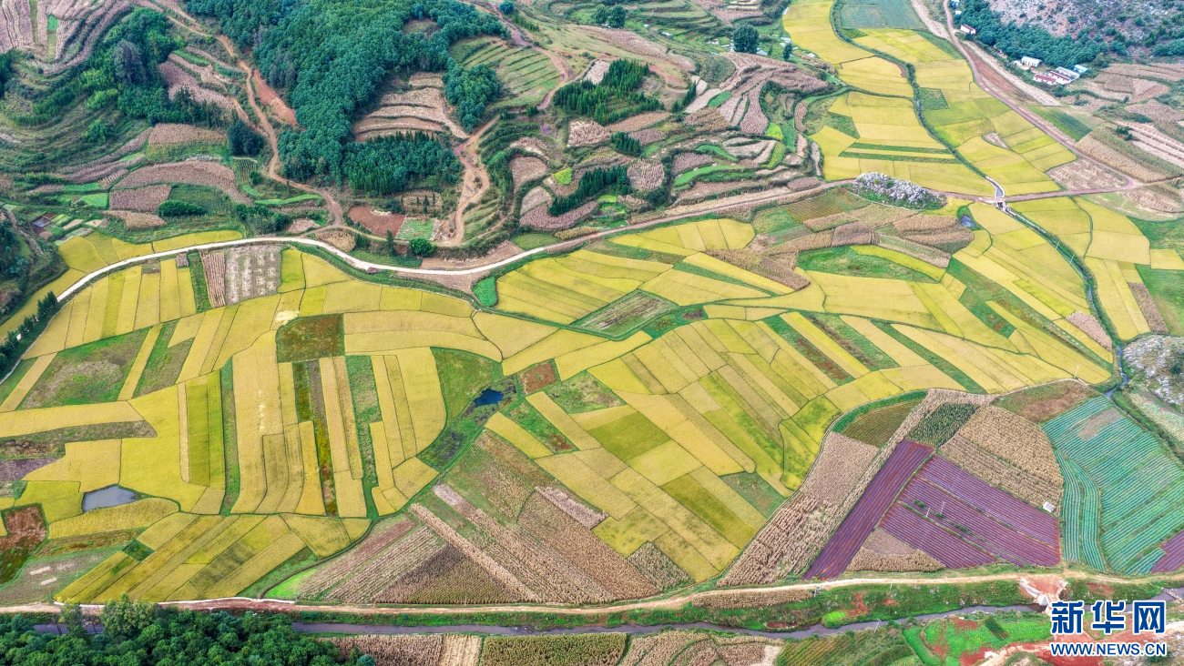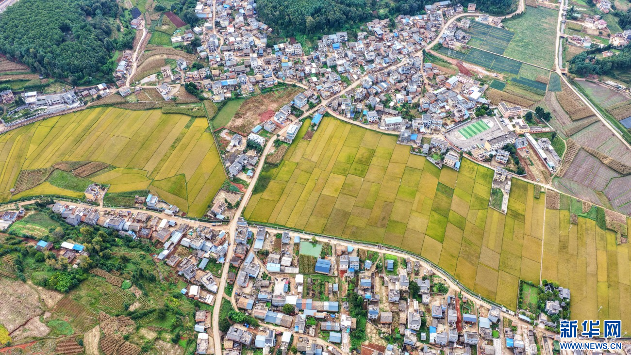 金秋时节,云南省曲靖市沾益区播乐乡乐利村“丰”景如画。在秋日大地的“调色盘”上,金黄色稻田呈条块状排列,与民居、绿树、山地、道路共同勾勒出一幅优美的田园丰收画卷。(孙文来)