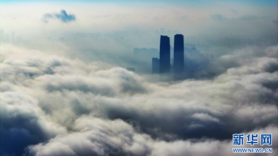 云雾中的昆明双子塔(摄于12月10日)。新华网 赵普凡 摄