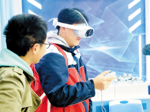 转场到信息学院、低空技术研究院,各式各样、功能各异的机器人整齐排列,让他们大饱眼福。“大家来试下AR吧,感受一下虚拟与现实交融的奇妙。”在老师的引导下,同学们戴上设备,沉浸式体验AR技术带来的惊喜。
