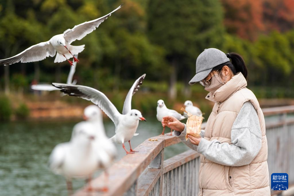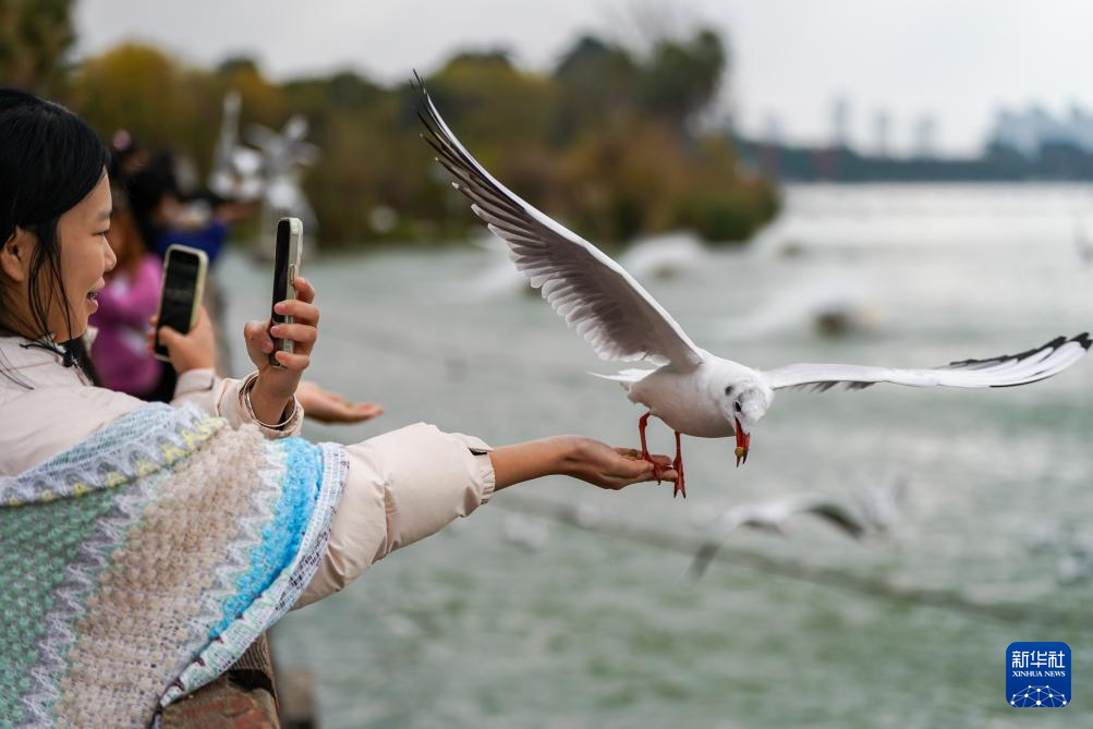 12月11日,游客在滇池畔的星海半岛生态湿地喂红嘴鸥。新华社记者 彭奕凯 摄